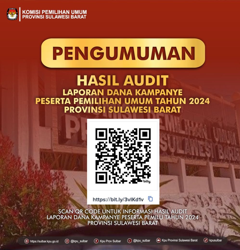 Pengumuman Hasil Audit Laporan Dana Kampanye Peserta Pemilu Tahun 2024 Provinsi Sulawesi Barat. Silahkan scan atau unduh di sini: https://drive.google.com/file/d/1tZx0jEV_2wbpDLvNPVPWkoB-2lse7xLS/view