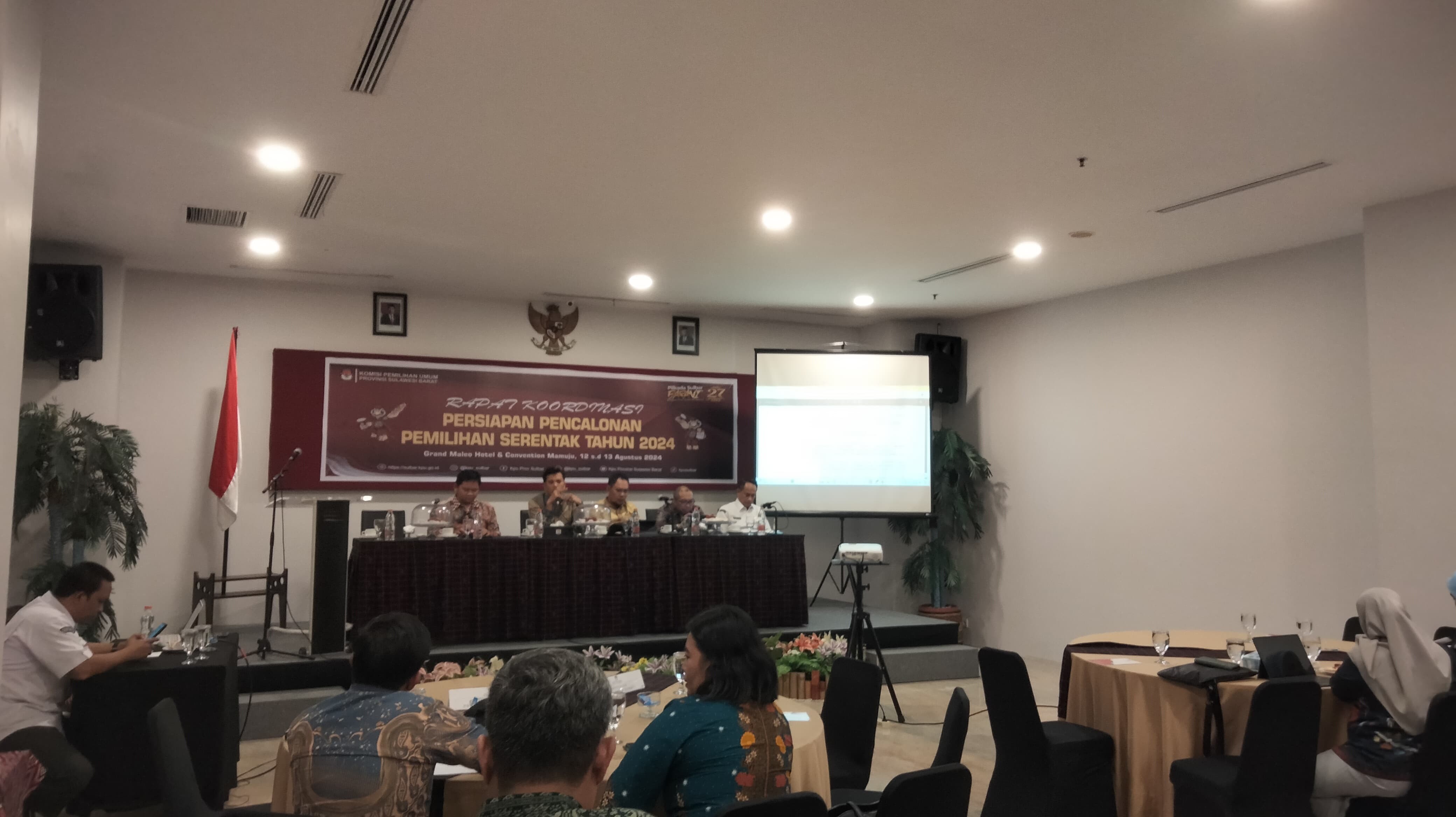 MAMUJU, KPU SUlbar -- Komisi Pemilihan Umum (KPU) Provinsi Sulawesi Barat menggelar Rapat Kooordinasi Persiapan Pencalonan Gubernur dan Wakil Gubernur, Bupati dan Wakil Bupati, Walikota dan Wakil Wali Kota Pemilihan Kepala Daerah Tahun 2024. Rakor berlangsung di Hotel Maleo Mamuju, Kamis (4/7/2024). Dalam sambutan Anggota KPU Provinsi Sulawesi Barat Ketua Divisi Perencanaan, Data dan Informasi Asriani menyampaikan, banyak hal yang harus dipersiapkan. PKPU Nomor 8 Tahun 2024 tentang Pencalonan dalam Penyelenggaraan Pemilihan Gubernur dan Wakil Gubernur, Bupati dan Wakil Bupati, serta Walikota dan Wakil Walikota pada Pemilihan Serentak Tahun 2024 perlu disosialisasikan. Juga teman-teman yang akan berkonsentrasi dalam hal ini, parpol tentunya akan mempersiapkan segala sesuatunya. "Dalam rapat koordinasi ini, kita sengaja mengundang narasumber dari Polda menyampaikan administrasi SKCK dan hal lain yang diperlukan. Dari Pengadilan Tinggi misalnya, terkait kepailitan seorang calon itu, dan administrasi yang dimungkinkan dan itu bisa disampaikan dan akan kita bahas tuntas dalam rapat koordinasi hari ini, ungkap Asriani. Anggota KPU Provinsi Sulawesi Barat Ketua Divisi Teknis Penyelenggara Pemilu Supriadi Narno menambahkan, Rakor yang melibatkan Bawaslu Provinsi Sulawesi Barat, KPU Kabupaten dan peserta Pemilu diharapkan mampu menyerap semua paparan yang disampaikan dari Pengadilan Tinggi dan Polda. "Nanti setelah dari sini, akan berkoordinasi langsung dengan Polres masing-masing, serta Pengadilan Tinggi untuk memperlancar proses ini dalam rangka ikhtiar kita melayani calon-calon kepala daerah." "Kita berharap setelah Rakor ini, proses pencalonan berjalan lancar, tidak ada kendala secara teknis," tutup Supriadi Narno kepala wartawan. Pemateri dalam kegiatan tersebut, Anggota KPU Provinsi Sulawesi Barat Ketua Divisi Hukum dan Pengawasan Elmansyah, Anggota KPU Provinsi Sulawesi Barat Ketua Divisi Perencanaan, Data dan Informasi Asriani, Wadir Intelkam Polda Sulbar AKBP Agung Budi Laksono dan Wakil Ketua Pengadilan Tinggi Sulbar Muhammad Damis. Hadir dalam kegiatan tersebut, Plh Sekretaris KPU Provinsi Sulawesi Barat Djumrah Assak, Kabag Teknis Penyelenggara Pemilu, Partisipasi dan Hubungan Masyarakat, Hukum dan SDM, Sahwan Susetyo, Kasubag dan Staf Sekretariat KPU Provinsi Sulawesi Barat. (Rilis Hupmas)