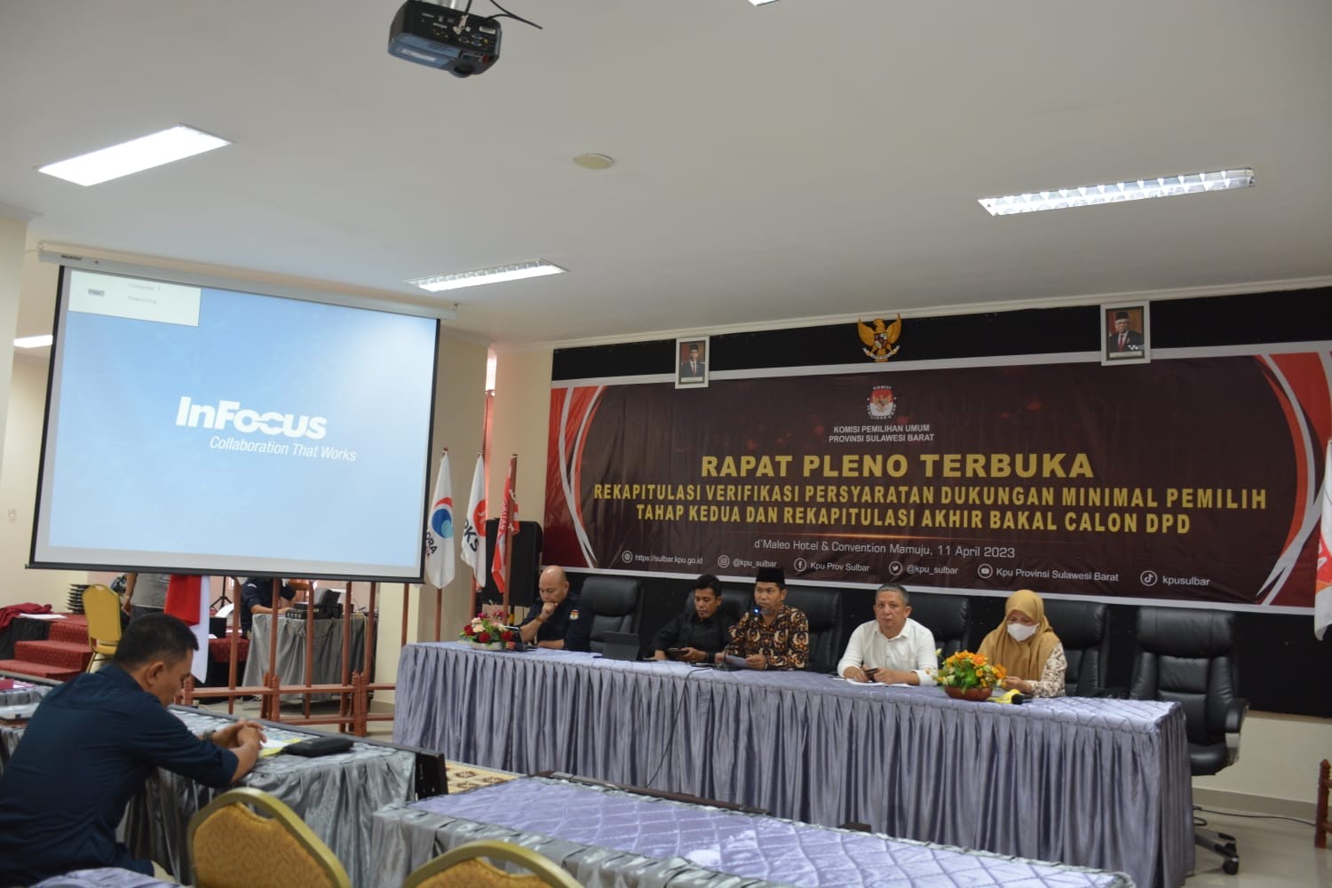 MAMUJU, KPU Sulbar -- Komisi Pemilihan Umum (KPU) Provinsi Sulawesi Barat menggelar rapat pleno terbuka Rekapitulasi Verifikasi Persyaratan Dukungan Minimal Pemilihan Tahap Kedua dan Rekapitulasi Akhir Bakal Calon DPD. Pleno digelar di Aula Kantor KPU Sulbar, Selasa (11/04/2023). Dalam pleno tersebut, KPU menetapkan sebanyak 25 bakal calon DPD Memenuhi Syarat (MS) sementara satu bakal calon dinyatakan Tidak Memenuhi Syarat (TMS). Sembilan bakal calon dinyatakan MS di tahap pertama dan di tahap kedua sebanyak 16 bakal calon DPD MS. Anggota KPU Provinsi Sulawesi Barat Divisi Teknis Penyelenggaraan Pemilu Said Usman Umar mengatakan, 17 bakal calon DPD telah selesai mengikuti proses verifikasi faktual tahap kedua. Said menjelaskan, ketika KPU Kabupaten melakukan verifikasi, hasil akhir ditemukan ada satu bakal calon yang ketika dijumlah proyeksi awal dengan tahap awal dan tahap kedua, tidak mencapai syarat dukungan 1.000. Maka dari 26 bakal calon, hanya 25 calon yang dinyatakan memenuhi syarat. "Nah perlu dipahami bahwa satu yang dinyatakan tidak memenuhi syarat, memasukkan dukungan di tahap kedua di KPU Pasangkayu dan KPU Mamuju. Di KPU Pasangkayu ada sekitar 12 yang dinyatakan dukungannya tidak memenuhi syarat dan di Mamuju ada 4, jadi total untuk dua kabupaten itu 16 dukungan yang tidak memenuhi syarat," kata Said kepada Tim Media KPU Sulbar setelah pleno dilaksanakan. "Ketika kita proyeksikan, karena dukungan yang dimasukkan dari dukungan awal dan kedua itu hanya 1.001, maka ketika ada satu atau dua saja TMS, maka tidak memenuhi syarat, karena tidak mencapai 1.000," sambungannya. Mantan KPU Kabupaten Polewali Mandar ini menguraikan, pleno yang dilakukan sudah final dan akan disampaikan ke KPU RI sesuai tahapan tanggal 13 sampai 17 April 2023. Selanjutnya KPU RI akan menetapkan bakal calon DPD. KPU RI akan mengeluarkan surat keputusan terkait dengan bakal calon DPD yang nantinya akan diserahkan dan diberikan ke masing-masing calon untuk digunakan dalam melakukan proses pendaftaran. "Jadi, di KPU proses itu sudah selesai. Apabila bakal calon ada yang tidak menerima proses ini, bisa mengajukan sengketa ke Bawaslu dengan berdasar pada SK KPU itu. Tentu 25 calon ini kita serahkan, apakah mau menggunakan keputusan hasil verifikasi itu atau tidak. Jadi yang bersangkutan itu menentukan pilihan, apakah akan digunakan untuk mendaftar tanggal 1 atau 14 Mei atau tidak digunakan," kata Said. Yang terpenting, jelas Said, untuk mengikuti proses tahapan kemungkinan tanggal 24 KPU akan mengumumkan pendaftaran, baik itu calon dari perseorangan maupun calon dari partai politik baik DPR, DPRD Provinsi dan DPRD Kabupeten. "Infonya, tanggal 1 sampai tanggal 14 itu adalah proses pendaftaran, kami mengimbau kepada semua kontestan untuk menyiapkan segala jenis persyaratan, baik secara administrasi maupun secara kepartaian, kalau dari partai. Sehingga kami bisa memudahkan kinerja, melakukan verifikasi terhadap syarat calon yang dimasukkan. Pleno dibuka oleh Ketua KPU Provinsi Sulawesi Barat Rustang didampingi Anggota KPU Sulbar lainnya, Adi Arwan Alimin, Farhanuddin dan Sukmawati M Sila. Berikut 25 Bakal calon yang ditetapkan MS. 1. Abd Jawas Gani 2. Almalik Pababari 3. Amir Hamzah ADJ 4. Andi Muh. Ichsan 5. Andri Prayoga Putra Singkarru 6. Bastian Basri 7. Bustan Basir 8. H. A. Muh. Ian Rusali. MP 9. H. Hamzah Sunuba 10. H. Iskandar Muda Baharuddin Lopa 11. H. Kalma Katta 12. Haji Husain 13. Harun 14. Hasan Bado 15. Heince Demmabuttu 16. Iswar 17. Jupri Mahmud 18. Leonar Bongga 19. Muhaimin Faisal 20. Muhammad Hatta Kainang 21. Risbar Berlian Bachri 22. Semuel Linggi Topayung 23. Sukardy Muhammad Noer 24. Supriadi Yusuf 25. Yaved Nataniel. Sementara satu bakal calon yang dinyatakan TMS Yunus Suparlin. (Rilis Hupmas)